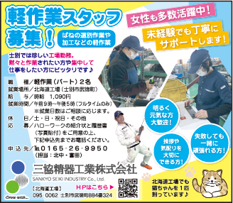 【募集】 ・士別浄化工業株式会社=清掃スタッフ ・士別軌道株式会社=パートタイム(バスSS柳井清掃、本社施設清掃など) ・ワークセンターきずな=生活支援員 【営業】 ○ヘアサロン くりはら=2月15日定休日、16日連休 ○菓子工房 もり屋=2月定休日のお知らせ(9日・15日・16日・23日) 【売家・貸室】 【ご案内・お知らせ】 ○名寄税務署=令和7年分確定申告のご案内 ○士別市交通安全母の会=交通安全研修会のご案内
